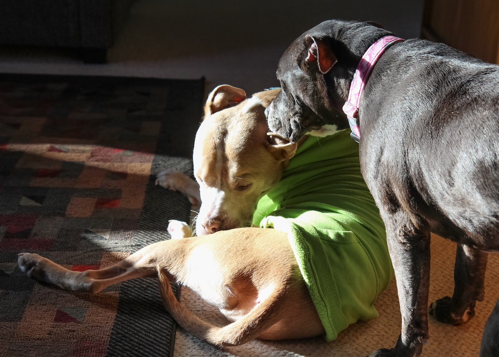 Even as a naughty, bratty teenager, Bixby was able to give Nala the confidence to go from cautiously observing to actively participating in family life. Within days she was hanging out in the kitchen with everyone instead of spending the evenings withdrawn under my desk. With Bixby by her side, she was eager instead of spooked to try learning simple commands. And once he was suitably respectful, she was eager to learn how to play with him. The difference he made was absolutely astonishing. Progress that I expected to take months was accomplished in days or weeks. Nala bloomed and bloomed and bloomed with cheerful Mr. B. by her side to demonstrate that things weren't scary! And it wasn't just a one-way street. While Bixby might have given Nala courage, Nala modeled good manners for Bixby. He would have remained much more of a wild child without her calming influence! They quickly formed a close bond.